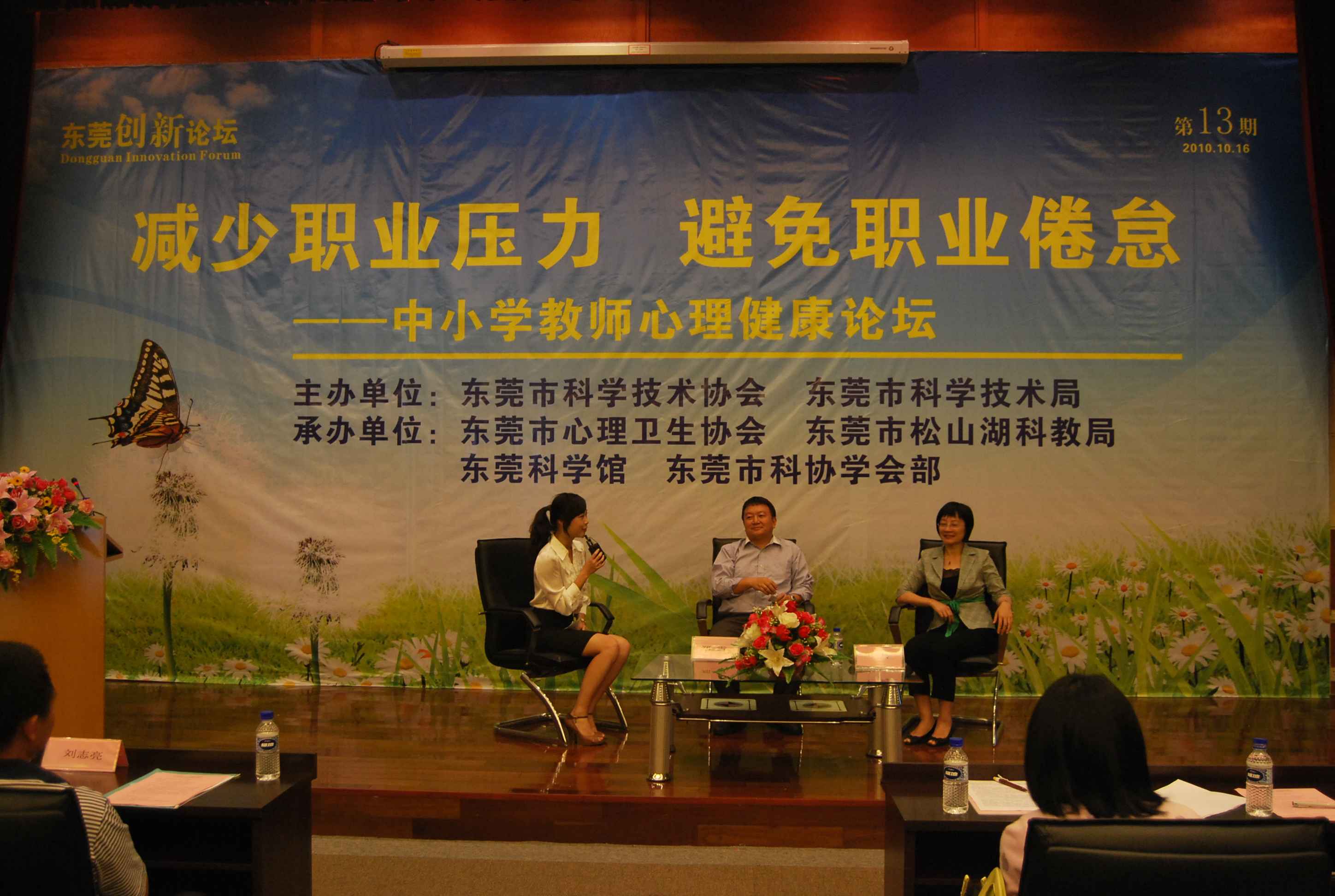 由东莞市科学技术协会、东莞市科学技术局主办,东莞市心理卫生协会、松山湖科教局、东莞科学馆、东莞市科协学会部承办的东莞“创新论坛”第十三期——“减少职业压力 避免职业倦怠” 中小学教师心理健康论坛于10月16日(星期六)上午9:00-12:00在松山湖学术交流中心三楼报告厅举行。