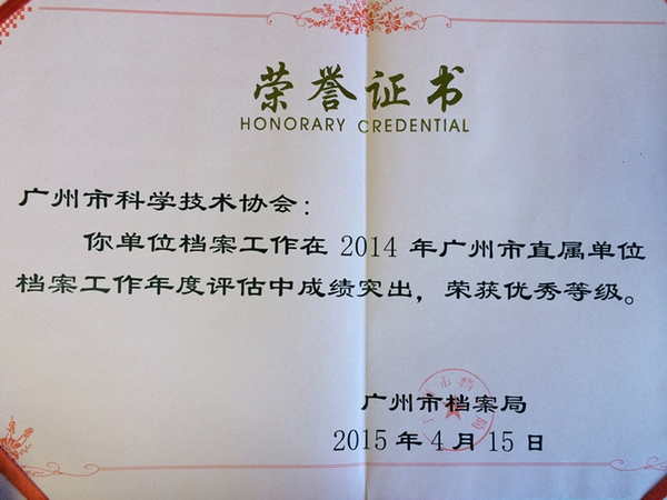 根据《广州市直属单位档案工作年度评估办法》的要求,广州市科协于2015年3月接受了广州市档案局开展的档案工作年度评估,并在评估活动中荣获“优秀”等级。通过本次评估,市科协档案工作的开展得到了积极推动,档案管理水平也获得进一步提升。
