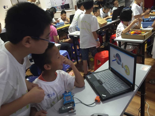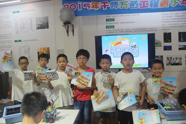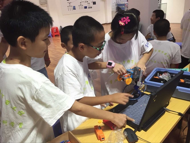 几块塑料拼版,一条数据传输线,一个马达,几颗螺丝帽,几组齿轮组合,在一双双灵巧的小手下,摇身变成一个个形象各异的机器人模型……在中山大学的2015年千师万苗工程青少年机器人科学营活动现场,来自广州市近40名青少年在欢乐融洽的氛围中,愉快地完成了为期3天的机器人课程的学习。