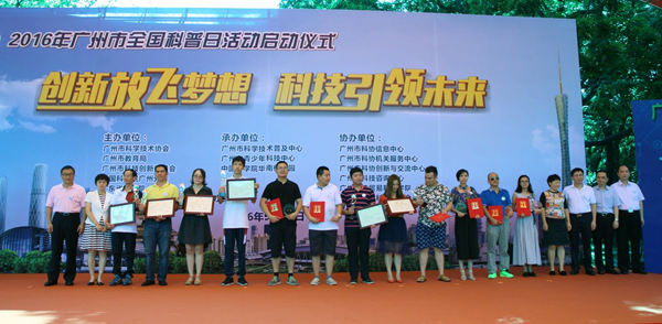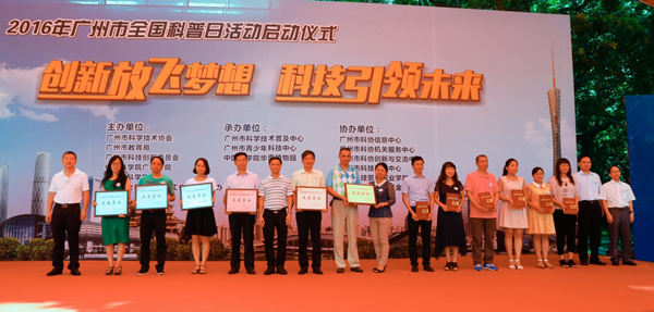 在启动仪式上,主办单位对全国科普示范区,全国科普示范社区和2016年广州市基层科普工作先进集体和优秀科普工作者以及广州市公民科学素质知识竞赛获奖单位进行了表彰,向广州市科普游自由行项目承担单位代表授牌。