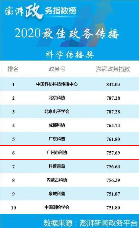 澎湃2020政务传播榜发布,广州市科协入选“科学传播奖”