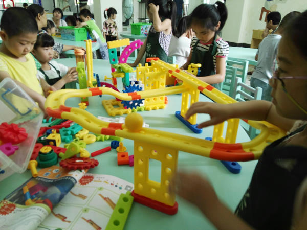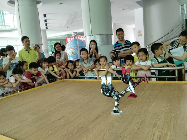 画画的孩子有着独特的想象力,在观看机器人表演时他们就表现出来了,这个喊着来个翻滚,那个喊着来一个金鸡独立。当然,机器人精彩的表演大大满足了大伙儿的要求并博得了阵阵掌声。进入科学乐园,神奇的天上来水、闪烁的空气泡、魔幻的辉光球、调皮的银蛋等科学展品,挑起了孩子们对科学探究的热情。而公众科学素质体验馆里可自己创作的科技积木,更是让孩子们都等不及老师演示完就自己动手来实践了。