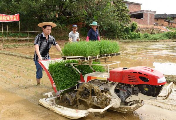 6月2日,和平县农机学会在青州镇星和村举行机械化插秧演示会。在演示会现场,插秧机在技术人员的操作下,又快又好地插出一排排整齐嫩绿的秧苗,赢得现场群众高度好评。水稻机械化插秧技术是农业机械作业的新技术,机械化插秧具有整齐、均匀、通风透光,有利于防治病虫害及禾苗生长、提高产量、提高效率等作用与特点,县农机学会通过举办水稻机械化插秧演示会,将技术送到田间地头,让农民朋友了解并掌握机械化插秧技术。