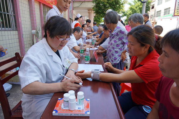 河源市医学会组织多名副高以上中医、妇科、内科、外科专家开展义诊活动,为150多位漳溪畲族乡群众看病开处方,并免费提供药品。
