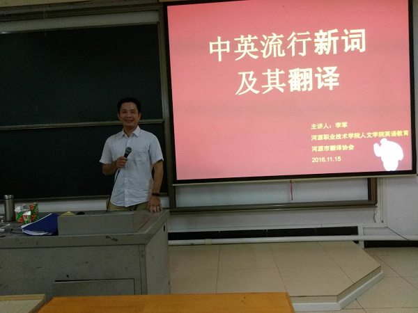 2016年11月15日晚,河源市翻译协会在河源职业技术学院教学楼C201举办了题为“中英流行新词及其翻译”的讲座,共70名英语专业的学生参加了此次活动。