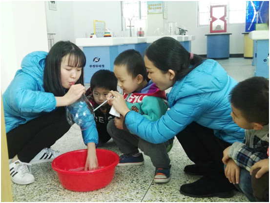 辅导员一边讲解一边邀请小朋友示范,同时引导小朋友在实验的同时边观察边思考,不时穿插知识问答,让每个小朋友都参与到活动中,体验到科学知识的魅力并沉浸其中,在快乐和思考中收获知识。