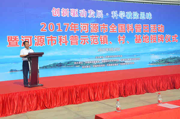 王卫、陈春林两位同志在启动仪式上讲话。王卫宣布河源市全国科普日活动正式开始。随后举行授牌仪式, 40家单位被授予河源市2017—2021年科普示范镇、村、基地牌匾。其中,源城区新江街道等6家单位被授予“科普示范镇”称号,东源县船塘镇三河村等14个村及社区被授予“科普示范村(社区)”称号,和平县青州镇山旮旯种植专业合作社等9个单位被授予“科普示范基地”称号;河源气象站等11个单位被授予“科普教育基地”称号。