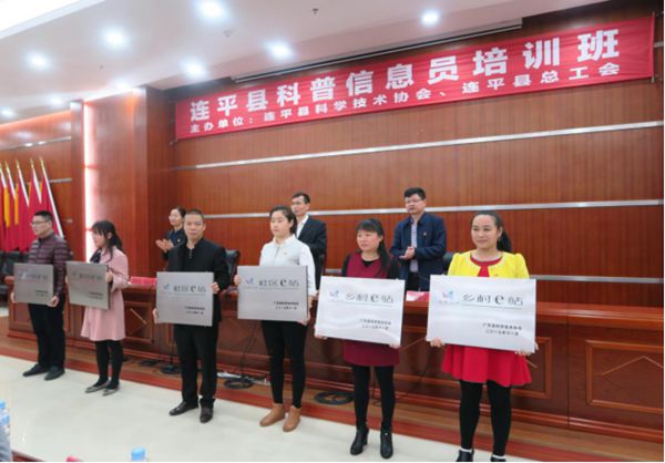 本次培训班还举行了授牌仪式。谢国定、郑文丰、何丽琴为连平“科普中国”e站的代表授牌。