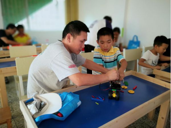 活动现场,家长们在会议室聆听讲师介绍STAEM教育发展历程与现状,了解机器人的教育理念对学生成长的帮助,孩子们则在操作室学习声控机器人基础知识。随后家长与孩子组队制作机器人,并进行竞速对战赛。