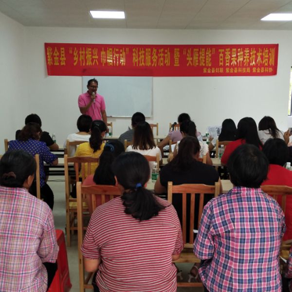7月18日,紫金县科协联合县妇联、县科技局在凤安镇钱顿农民种养专业合作社举办紫金县“乡村振兴巾帼行动”科技服务活动暨“头雁提能”百香果种养技术培训班。本次培训班由台湾知名水果专家蔡政仁主讲。钱顿农民种养合作社社员和周边百香果种植户共63人参加培训。