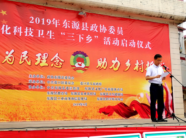 5月10日上午,东源县科协联合县政协、县委宣传部、县卫健局、县文广旅体局、县工商信局等部门在蓝口镇开展“践行为民理念,助力乡村振兴”为主题的文化科技卫生三下乡宣传咨询活动。县政协主席黄海泉出席活动并讲话,县政协副主席、县科协主席李添鸿主持活动启动仪式。