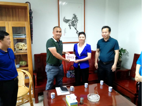 市科协副调研员辛小龙到广东轩朗实业有限公司慰问华路(左),在市科协会见、慰问高芳亮(右)