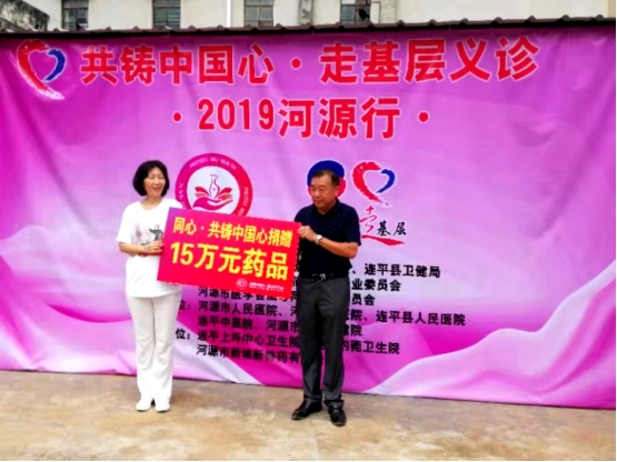 爱心人士贺永莉女士为此次公益活动捐赠了价值15万元药品,由上坪中心卫生院副院长谢胜友接收。