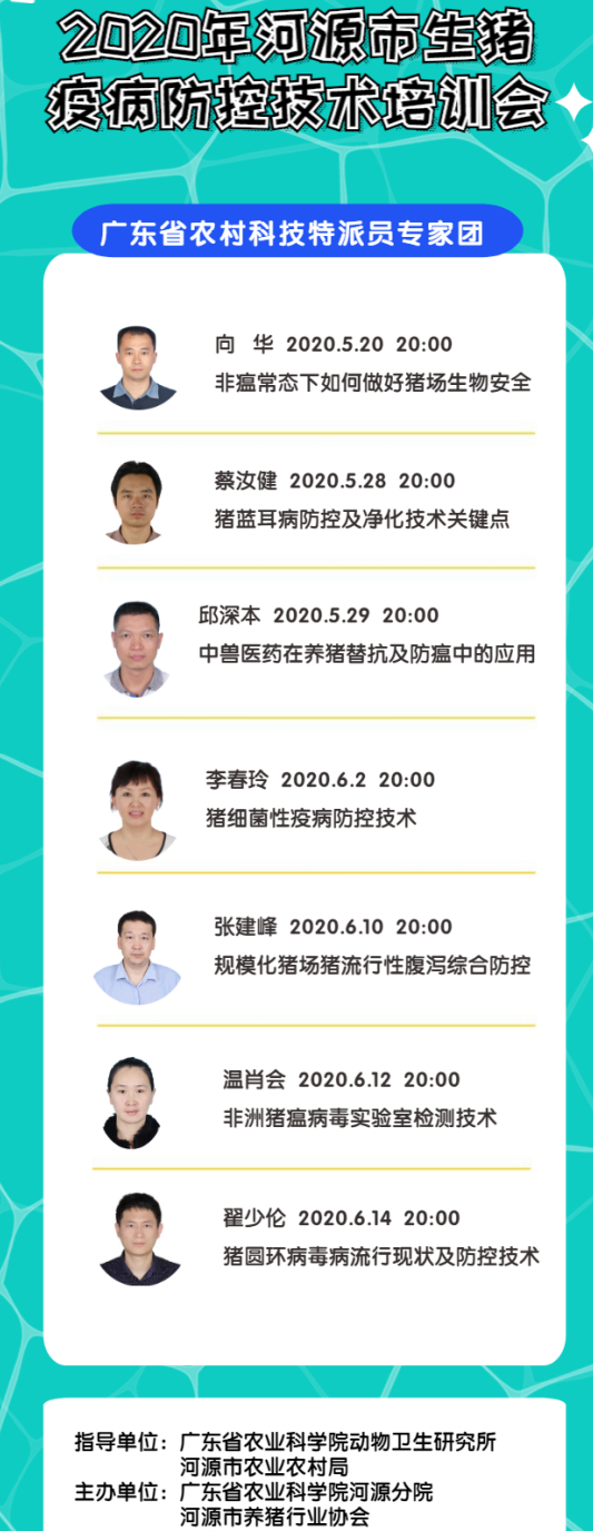 为进一步提高河源市生猪疫病防控技术,强化科技支撑与指导服务,5月20日起,河源市养猪行业协会联合广东省农业科学院河源分院举办生猪疫病防控培训会,面向生猪养殖户开展远程网络培训。
