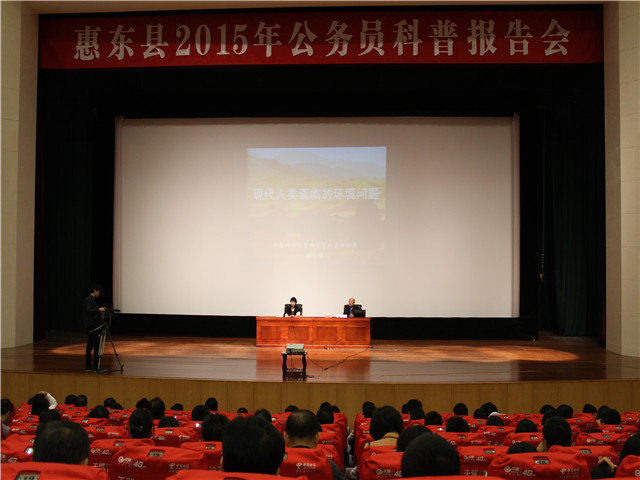 徐文耀教授为惠东县400多名领导干部和公务员作了题为《现代人类面临的新的环境问题》的精彩报告。徐教授从地球的可持续性居住和可持续性发展两个视角分别展开,深入浅出地阐释了现代人类所面临的新的环境问题,并通过一个个经典的案例告诉我们,保护环境、保护地球家园是全社会的责任和义务。报告内容既有理论上的深度,又有鲜明的事实例证,让公务员们深受教育和启发。