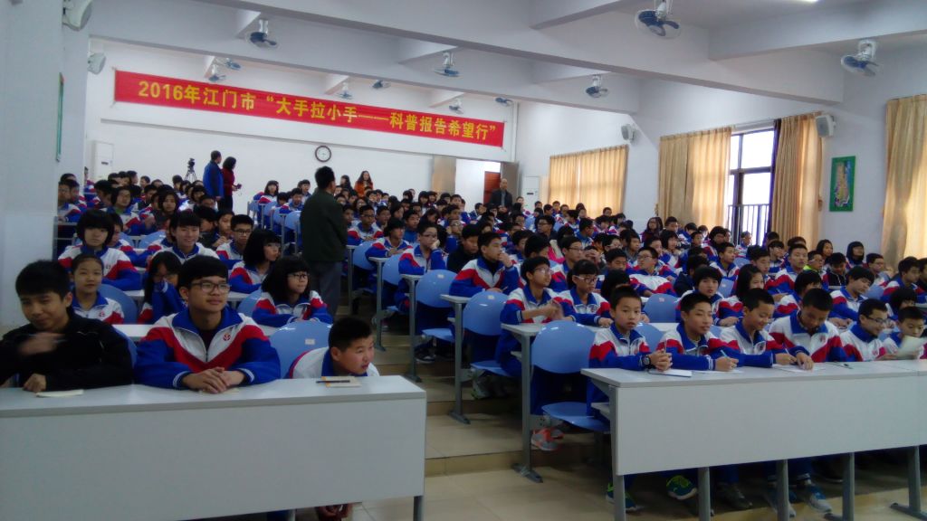 鹤山市科协按照江门市科协、教育局《关于开展“2016年江门市‘大手拉小手-科普报告希望行’活动”的通知》要求,联合鹤山市教育局实施工作部署,于3月16日至17日邀请中国科学院科普讲师团成员郭传杰、韩莉两位老科学家,分别走进鹤山市共和镇中心小学、共和镇中学、沙坪街第六小学、沙坪街中学、沙坪街实验中学、鹤城镇第二中学等6所中小学校,为在校近万名师生举办“大手拉小手-科普报告行”活动。老科学家为中小学校面授科普知识的做法深受中小学校的欢迎。