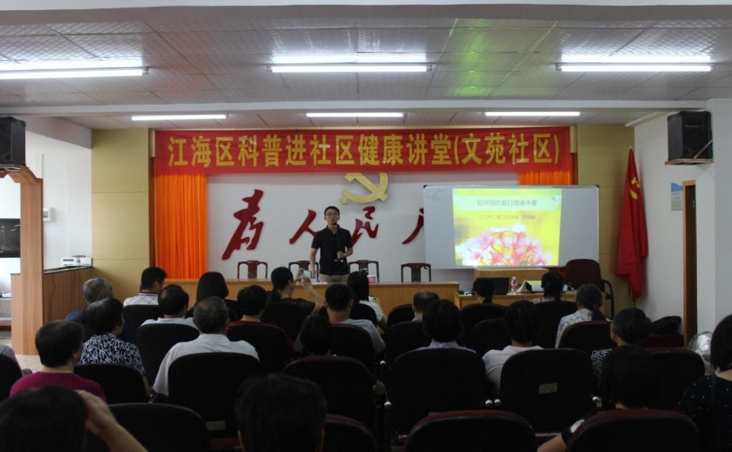正值进入夏秋之交,既有夏天的炎热,又有秋天的干燥,人很容易进入“情绪中暑”的状态,江门江海区科协深入开展科普进社区-健康讲堂活动,于9月20日上午邀请了江门市第三人民医院心理咨询医师陈捷峰一同走进文苑社区为60多名社区群众举办“如何预防情绪中暑”专题讲座。