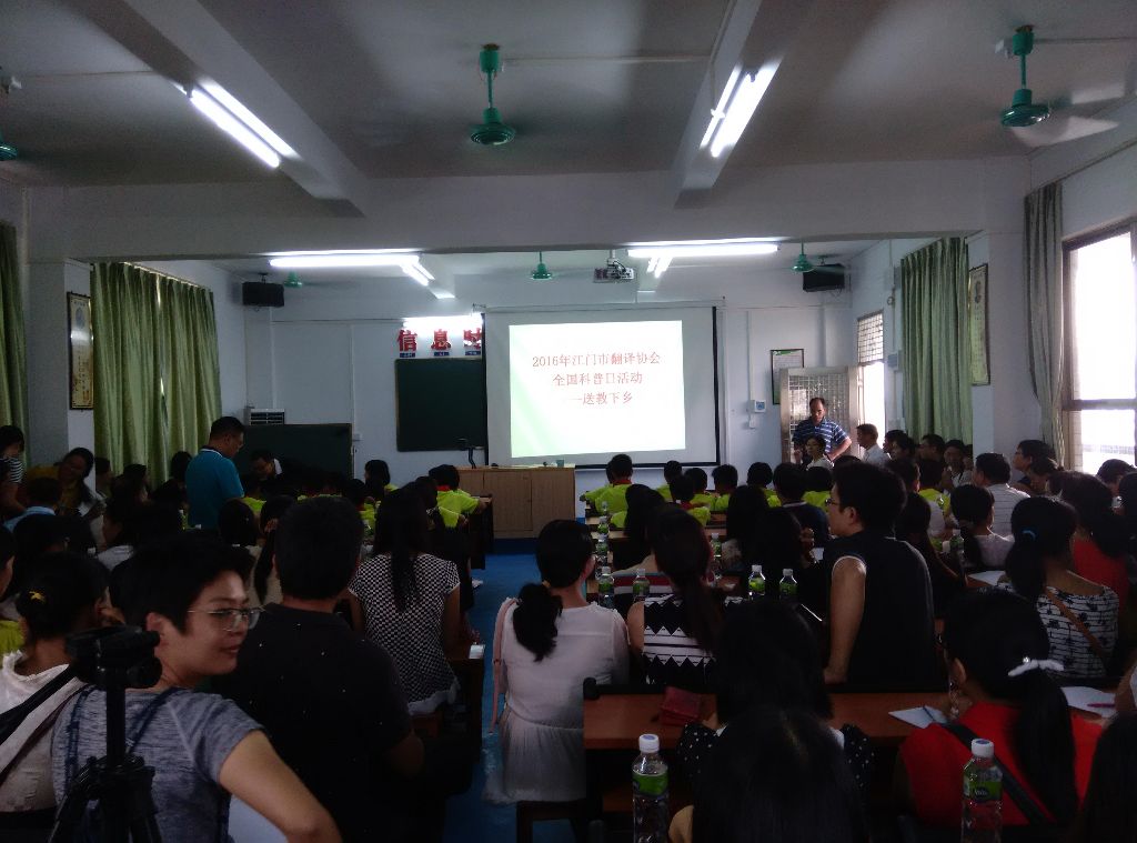 江门市翻译工作者协会在纪念全国科普日期间,充分发挥协会名师、骨干教师的示范引领作用,于9月23日在市翻译工作者协会理事长黄启汉带领下一行7人,来到恩平市君堂镇大江中心小学,面向乡村50多名小学生上了一堂教学示范课,来自恩平市乡镇的150多位乡村小学英语教师聆听了示范课,并进行互动交流。