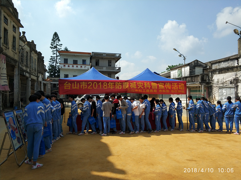 4月10日,台山市科协为全面贯彻落实《江门市全民科学素质行动计划纲要实施方案(2016-2020年)》,围绕“增强防震减灾意识 积极应对地震灾害”的宣传主题,于当日上午组织科普志愿者走进三合镇那金圩向居民群众开展防震减灾科普宣传咨询活动。活动吸引了500名居民群众和学校师生参加。此次宣传增强当地居民群众防震减灾意识,提高自我保护和应急救援能力。