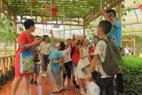 在公园讲解员的引导下,学生和家长们首先参观了农业嘉年华游乐园。学生们对“农业嘉年华——蔬之物语”展馆的高科技栽培蔬菜表现出了浓厚的兴趣和求知渴望,通过讲解员对植物种植科普知识的讲解,让大家感受到各种廊架种植的艺术之美和无土栽培的现代农业种植魅力的同时,也品尝了一个生动丰富的蔬菜文化大餐。随后,学生和家长们还分别参观了“农业嘉年华——瓜样年华”、“农业嘉年华——灵草秘境”展馆和儿童乐园等,被馆内的迷你家族区植物和奇瓜异形区植物所深深吸引。该馆的现代农业立体栽培技术、互动体验以及动漫文化,展现了一个轻松、多彩、娱乐的瓜果乐园,还让大家体验了自然之美、探索了科学之妙,寓教于乐,并在玩乐中学习到现代农业种植科学知识。