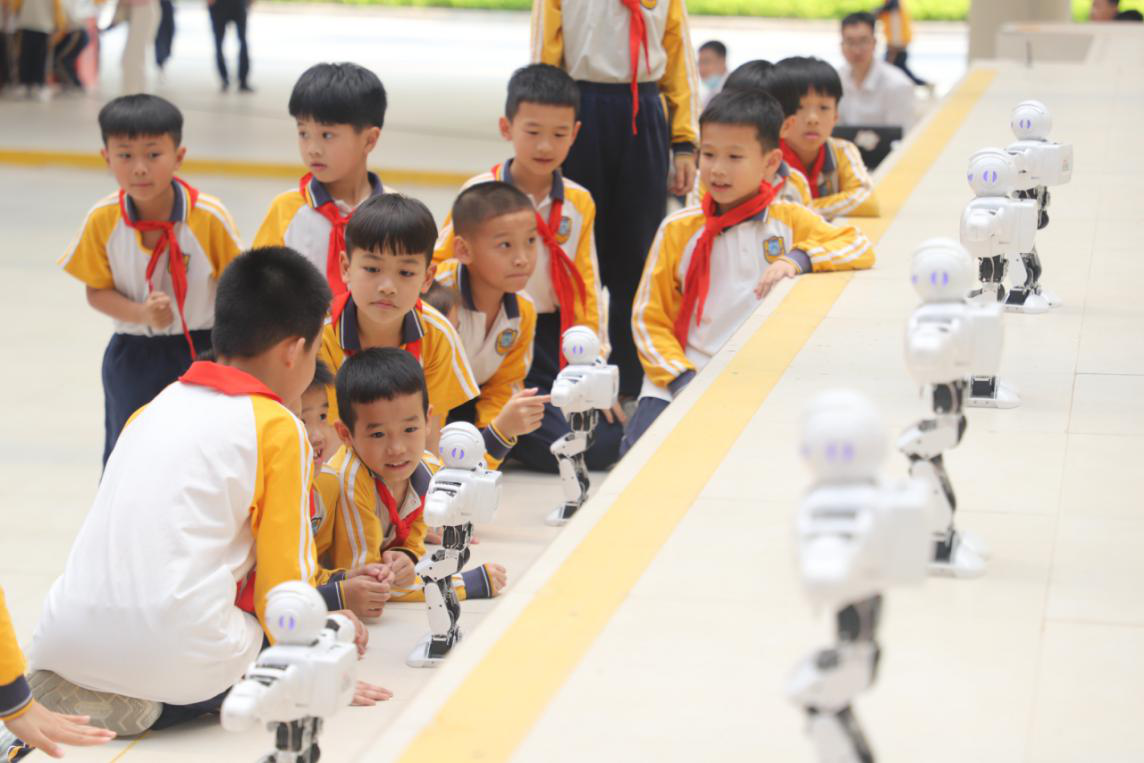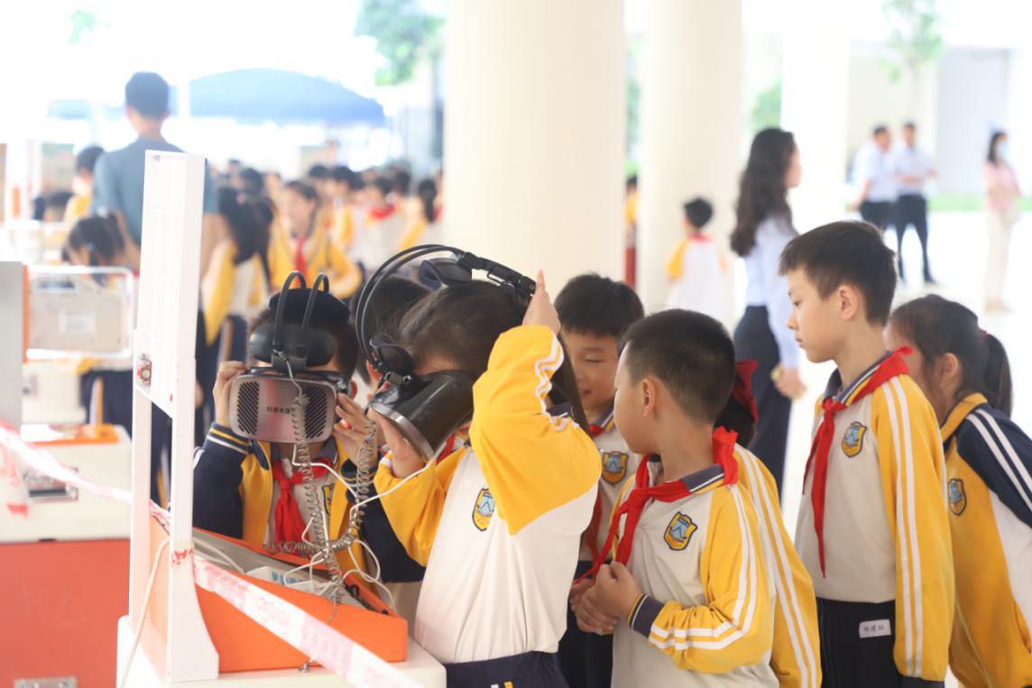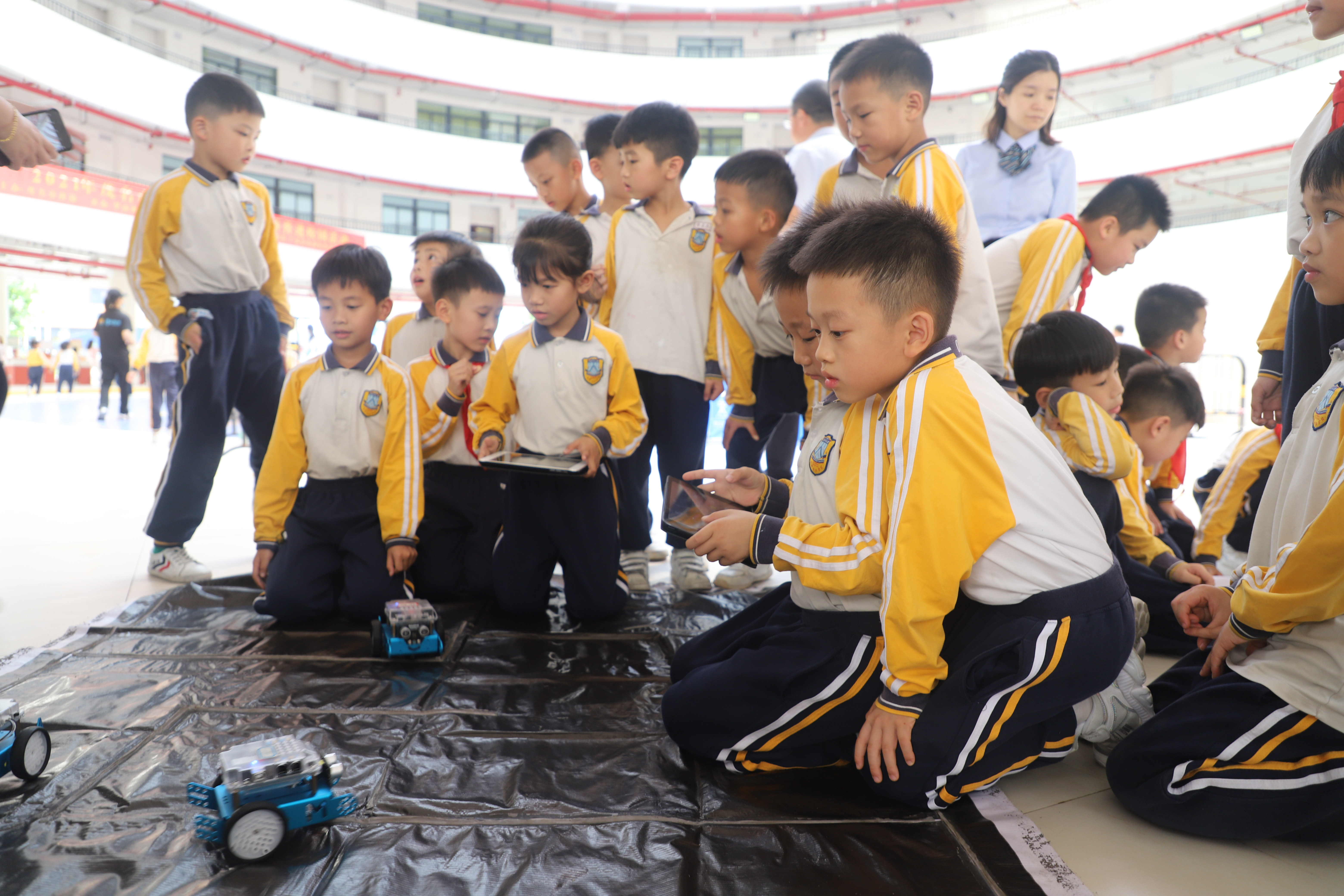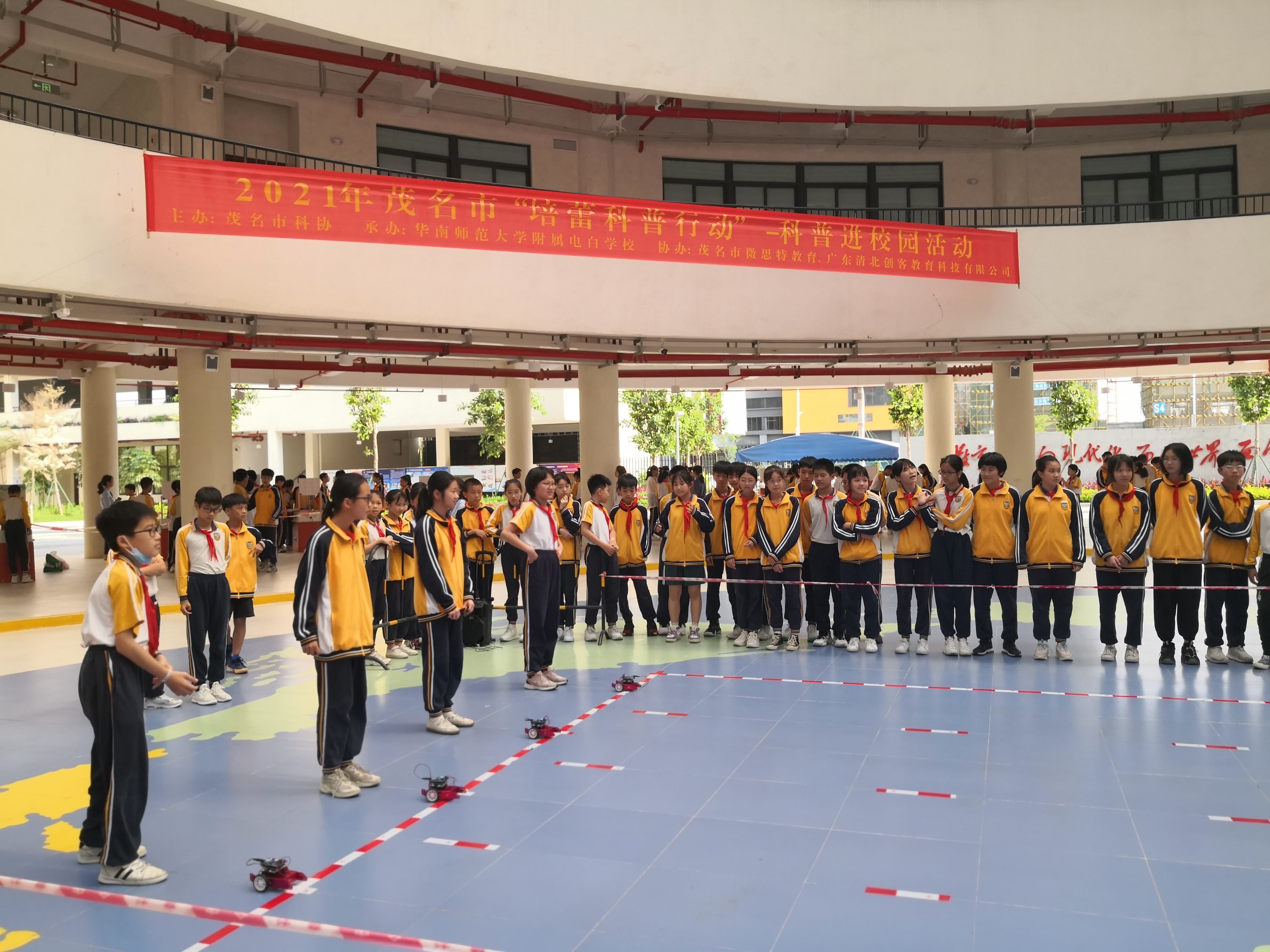 茂名市微思特教育、广东清北创客教育科技有限公司给学生们带来了机器人表演、无人机竞技、声控小车互动、电脑编程展示、创新作品展出等科技竞技活动项目,工作人员指导师生进行了操作体验。