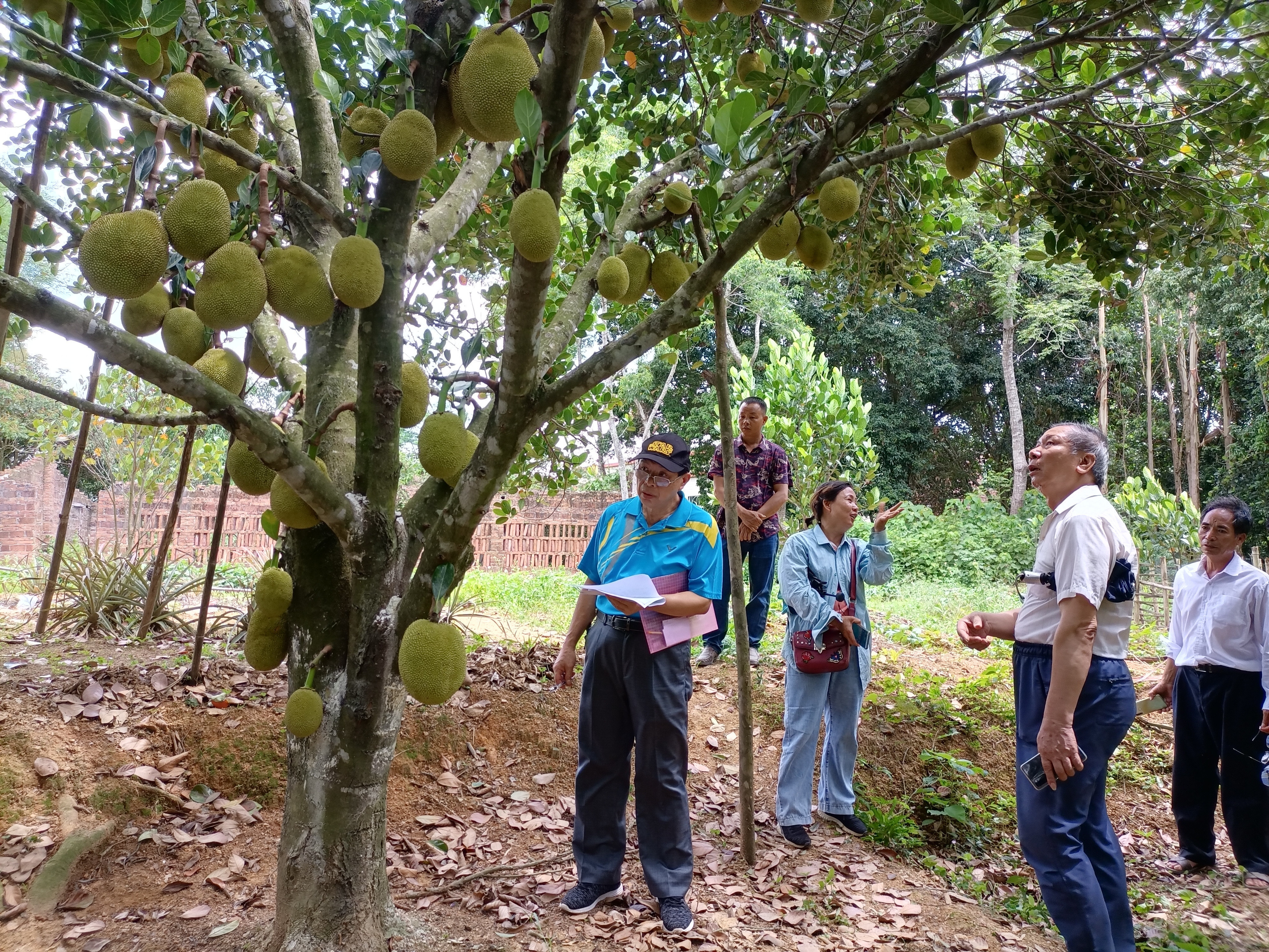 茂名市老科协会秘书长邓振权(左一)深入化州市林尘镇棠美村基地调研常有菠萝树挂果生长情况