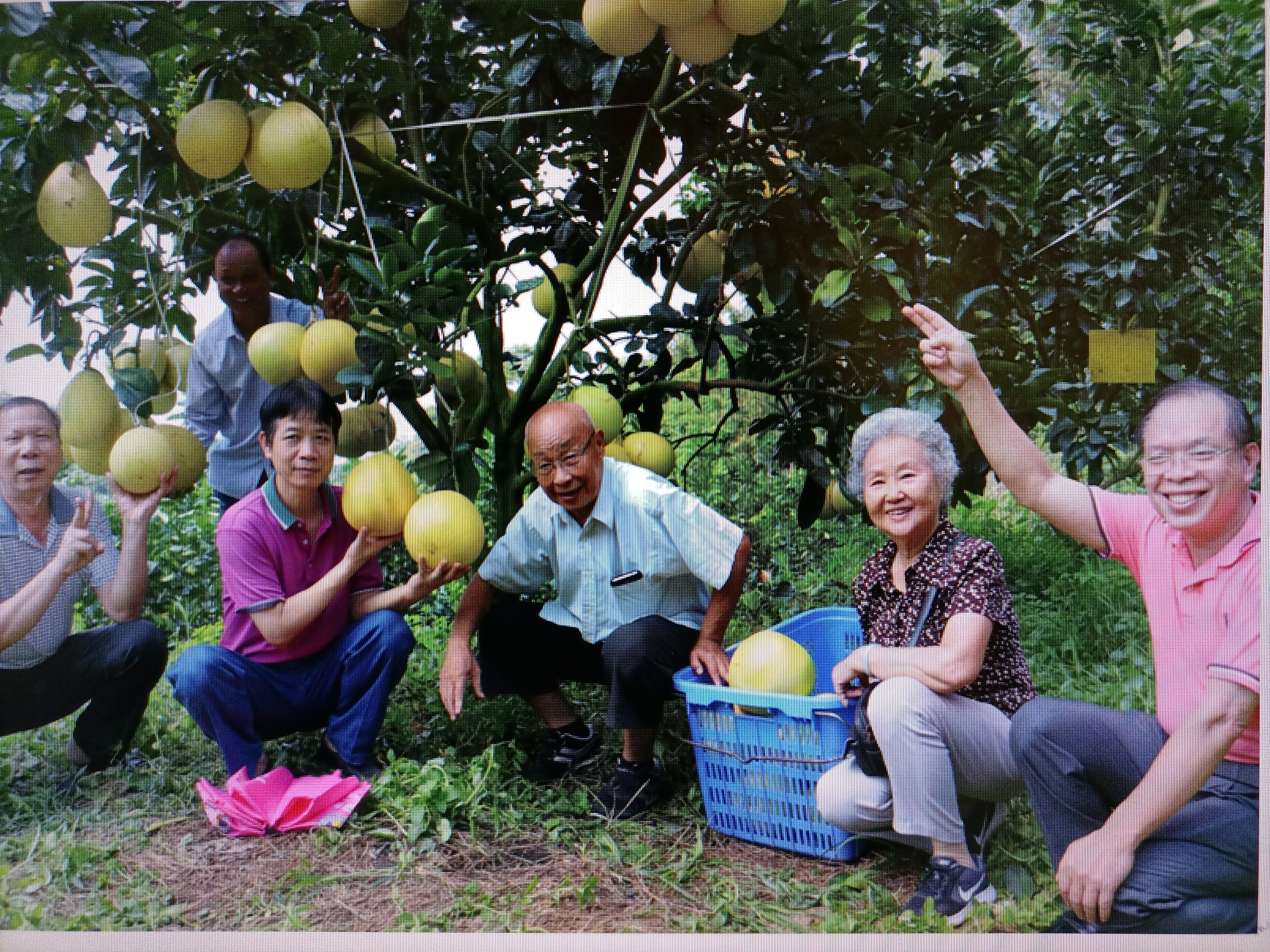 图为茂名老区种植“三红蜜柚”今年喜获丰收,市老科协调研组感到非常高兴并合影留念。