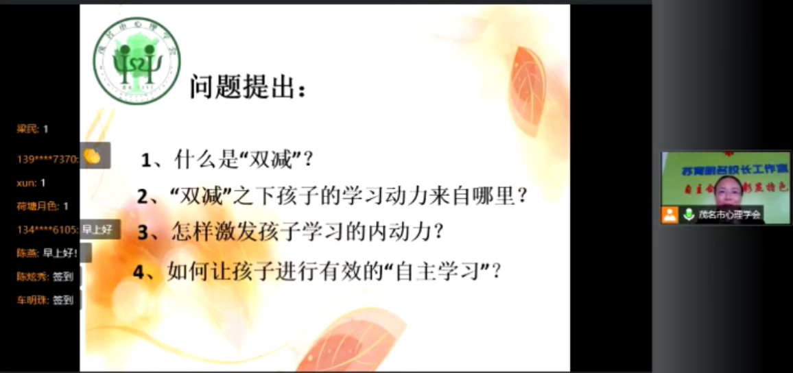 1月3日上午,茂名市心理学会在腾讯会议在线举办学术交流会第三场专题讲座,讲座邀请了茂名市心理学会的副秘书长兼茂南区第一小学校长苏育明担任主讲嘉宾,讲座题目是《“双减”之下,孩子该如何学会“自主学习”》。