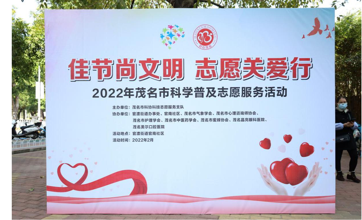 为认真贯彻落实党的十九届六中全会精神,更好发挥志愿服务在改善民生、凝聚民心的重要作用,弘扬好心精神,2月24日下午,由茂名市科协主办的2022年茂名市“佳节尚文明 志愿关爱行”科普进社区活动在茂南区官南社区街心公园举行。