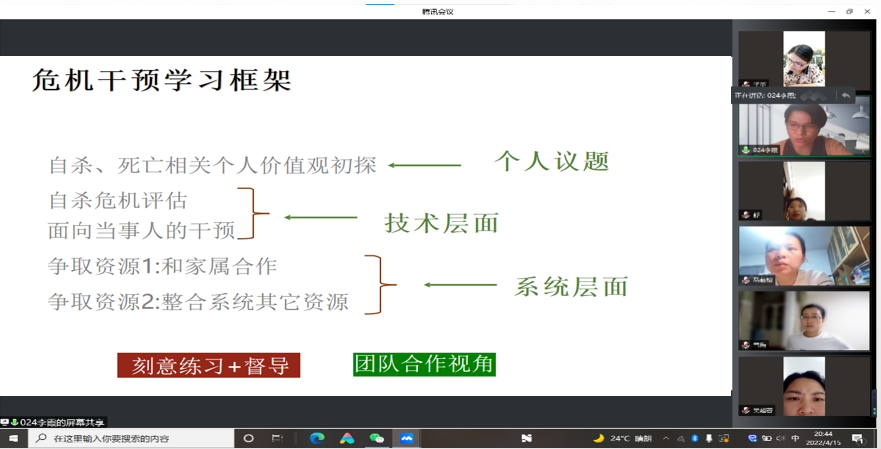 4月15日,茂名市心理学会通过腾讯会议对心理援助热线志愿服务队开展第三期心理援助热线线上培训。根据咨询师在部分热线接听工作中存在心理危机方面的风险和压力等情况,在第三期培训中,学会邀请茂名市心理学会副理事长李霞老师为热线咨询师专门开展了热线心理危机专题培训。