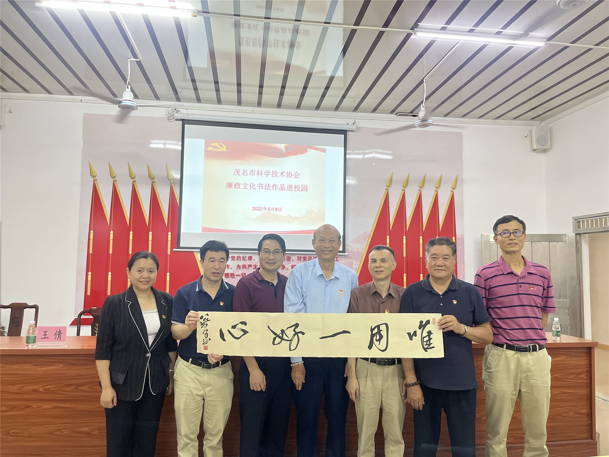 活动中,市科协机关党支部还开展廉政文化书法作品进校园活动,市科协党组成员、副主席、党支部副书记杨灿叶将自己的书法作品赠给汉山学校,勉励广大青少年学生弘扬好心茂名精神,不负时代、不负韶华,以史为鉴、开创未来,踏实肯干、努力拼搏,为祖国建设奉献青春和力量!