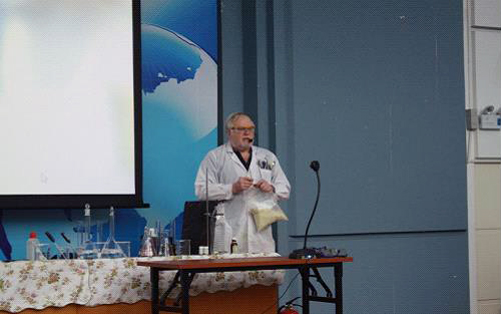 7月20日上午,北京化工大学英籍专家戴伟教授(David G. Evans)在学术报告厅为参加2015年北京化工大学科学营的同学们带来了一场精彩而富有国际气息的趣味化学实验演示。戴伟教授以有关双氧水丰富多彩的化学反应为核心内容进行演示。同时又通过简易实验、小游戏等形式,形象而具体的分析了影响化学反应速率的各种因素,有理有据分析透彻。演示过程中,他让同学们参与互动,制作荧光棒和绿色泡沫在现场掀起了一波又一波的小高潮。戴伟教授形式多变、趣味盎然的实验和教授特有的西方式幽默感极大的激发了同学们对化学实验的兴趣。