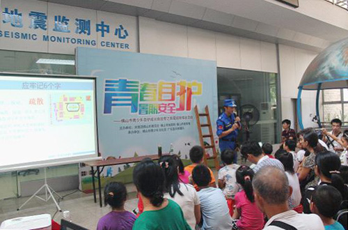 2016年8月11日上午,由共青团佛山市委员会、佛山市地震局、佛山市教育局主办的“青春自护·暑期安全”为主题——佛山市青少年自护成长体验营之防震避险体验活动在广东省科普教育基地——佛山市地震科普馆举行。