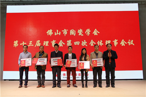 最后,由佛山市陶瓷学会理事长冯斌为新增的13家团体会员颁发了牌匾以及理事证书,由学会顾问、来自华南理工大学的曾令可教授、饶平根两位教授为获得“2015~2016年推动佛山陶瓷行业科技进步人才”的16位杰出人才与优秀人才颁发证书,本次理事会圆满结束。