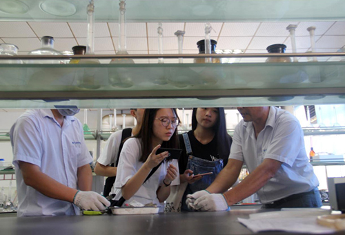在邦普基地讲解员的陪同下,华侨学子首先参观了邦普研发中心实验室。并现场观摩了研发工程师特意准备的电池拆解实验,近距离观察了电池的拆解过程及内部结构,并不时提出疑惑,实验员耐心一一解答,学子们还切身体验了实验过程中的某些环节。实验结束后,他们欣喜地感叹到:“这是学校里、课本上无法体验到的,邦普的电池拆解实验帮助我们把知识运用到了实践中。”