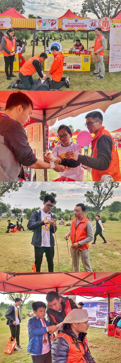 佛山市防灾减灾协会以“防灾减灾知识宣传”为参展项目,项目内容分为四大块:义卖应急包、学习包扎技能、进行心肺复苏体验和结绳培训。活动目的是做好防震减灾的志愿宣传活动,让善行者亲身体验并学习包扎的技能,提升佛山善行者的防震减灾知识的普及率。