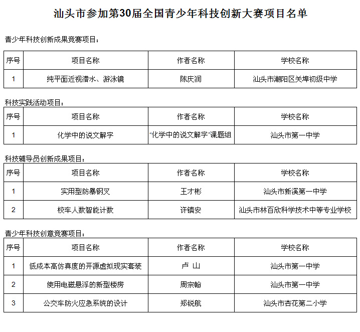 汕头市7个项目被推荐参加第30届全国青少年科技创新大赛