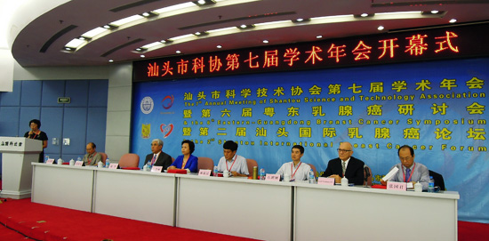 汕头市委常委马逸丽、市人民政府副市长林依民、中国医学科学院肿瘤医院原院长、中国癌症基金会副理事长赵平教授、汕头大学医学院党委书记石刚刚等有关领导出席了会议开幕式。来自国内外的肿瘤研究专家Giuliano AE教授、复旦大学肿瘤医院邵志敏教授等知名学者应邀参加会议。汕头市科协主席洪建芬、汕头市抗癌协会理事长、汕头大学医学院附属肿瘤医院院长张国君代表主办方致欢迎辞。汕头大学医学院党委书记石刚刚、汕头市委常委马逸丽作了重要讲话。