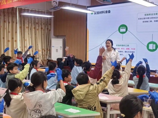 随后,助理研究员梁黄冰硕士带来《解锁植物彩虹的奥秘——花青素的健康魔力与科学探索》课程,通过实验操作解析花青素遇酸碱性物质变色的特性,带领同学们认识天然指示剂,感受科学的奇妙。两堂科技课生动有趣、干货满满,为孩子们播下了科学的种子。