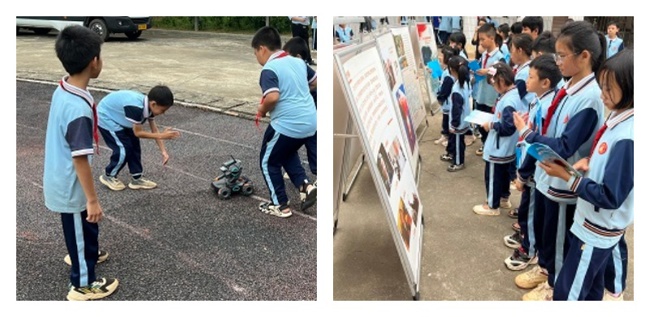 活动现场设置四大特色展区,科技感扑面而来。无人机展演区率先掀起高潮,专业飞手操控设备完成空中盘旋、八字编队等动作,随后切换至“农业巡园模式”——无人机搭载摄像头低空掠过模拟果园,实时传回的画面清晰呈现“果实”长势,科普志愿者详解其在郁南无核黄皮种植中的监测应用,让学生直观感受科技助农的力量。