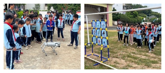 智能互动区里,机甲大师与机器狗成为“人气明星”。在志愿者指导下,学生们操控机甲大师完成障碍穿越,精准的转向与响应引得阵阵喝彩;一旁的机器狗则表演了后空翻、握手等特技。