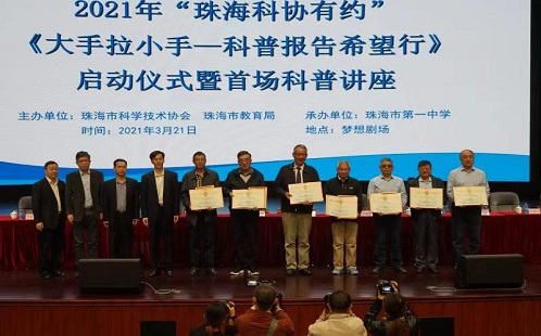 3月21日,2021年“珠海科协有约”《大手拉小手—科普报告希望行》活动在珠海市第一中学拉开序幕,珠海市第一中学1300多名师生参加启动仪式并聆听首场报告会。在接下来的一周里,53场科普报告活动将在珠海中小学校园接连上演,7位中科院老科学家将带领师生们畅游科学世界,了解学习各学科的前沿知识,感受科学带来的奇妙和乐趣。