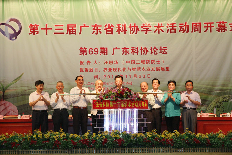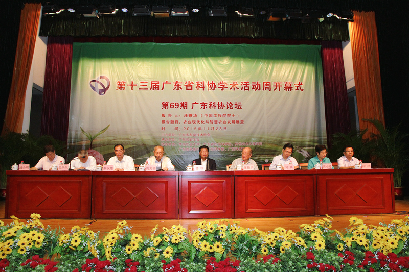 11月23日,第十三届广东省科协学术活动周开幕式暨广东科协论坛第69期报告会在广东科学馆大礼堂举行。广东省委常委、统战部部长林雄出席活动并宣布学术活动周开幕。中国工程院院士汪懋华应邀作了《农业现代化与智慧农业发展展望》的学术报告。广东省科协党组书记、副主席何真主持学术活动周开幕式。广东省农业厅巡视员(党组成员)、省农学会会长蔡汉雄主持报告会。省科协领导同志,省科协第八届全省委员会委员,省相关社团组织及地市科协负责同志,省农业厅、省农科院、华南农大、仲恺农业工程学院等单位领导,惠州、中山等周边市农学会代表,来自省、市农业行政、教学、科研部门单位的干部、科研人员、专家学者,以及新闻界的朋友等,共约500人参加了这次活动。大礼堂全场座无虚席。