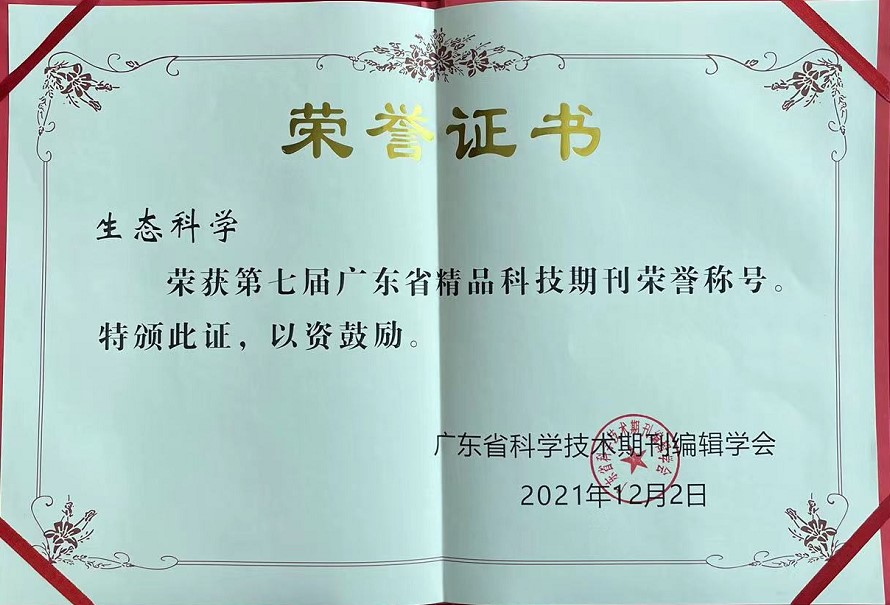 省生态学会主办的《生态科学》荣获第七届广东省精品科技期刊荣誉称号