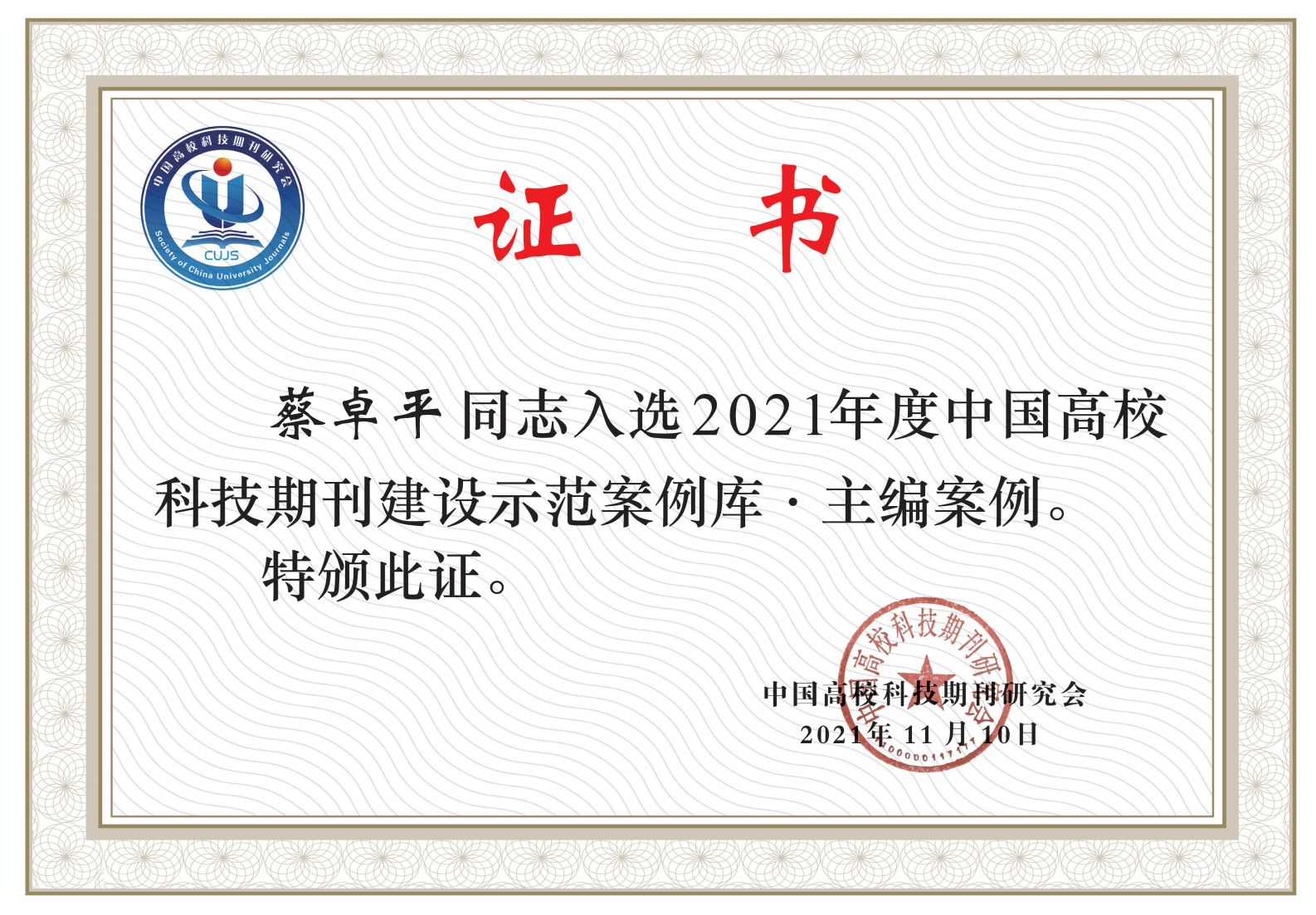 11月11-13日,中国高校科技期刊研究会第25次学术年会(线上+线下)顺利召开。大会公布了首批“中国高校科技期刊建设示范案例库·编辑团队及编辑个人入库案例”的遴选结果。省生态学会秘书长、《生态科学》常务副主编、广州市生态学学会秘书长、博士蔡卓平入选2021年度中国高校科技期刊建设示范案例库·主编案例。