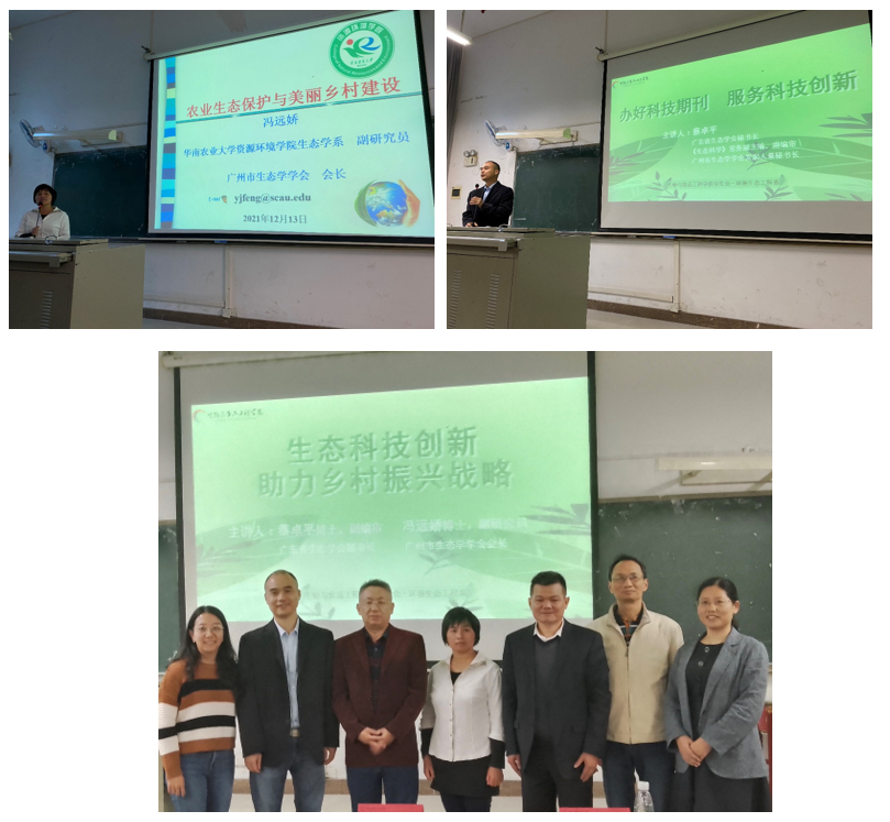 12月13日下午,省生态学会秘书长、《生态科学》常务副主编、广州市农村科技特派员博士蔡卓平,广州市生态学学会会长、华南农业大学资源环境学院副研究员、博士冯远娇受邀面向广东第二师范学院生物与食品工程学院全体师生开展“生态科技创新助力乡村振兴战略”专题讲座。讲座由该学院副院长吴映明致欢迎辞,环境生态工程系主任刘金苓主持。